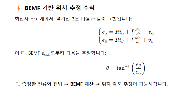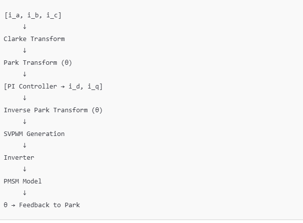 직접 돌리기 전에, 가상으로 돌려보자!🧠 왜 시뮬레이션이 중요한가요?FOC(Field-Oriented Control)는 수식과 벡터 기반 제어이기 때문에,수치 해석 기반 시뮬레이션을 먼저 해보는 것이 실제 구현보다 훨씬 안전하고 효율적입니다.이점설명💥 하드웨어 리스크 ↓과전류·불안정한 회전 없이 사전 확인 가능🧪 파라미터 튜닝PID, MTPA, 속도 응답성 확인🔍 내부 전류·자속 분석실시간 전류 벡터, 토크, 회전속도 가시화🧭 센서리스 실험도 가능추정된 위치 vs 실제 위치 비교 검증📁 시뮬레이션 구성 요소 (기본 블록)블록기능Motor Model (PMSM/IPMSM)모터의 전기적, 기계적 특성 모델링Clarke / Park Transform전류 변환PI Controller (id, iq)전..