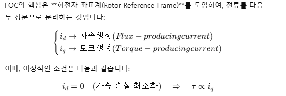 직접 돌리기 전에, 가상으로 돌려보자!🧠 왜 시뮬레이션이 중요한가요?FOC(Field-Oriented Control)는 수식과 벡터 기반 제어이기 때문에,수치 해석 기반 시뮬레이션을 먼저 해보는 것이 실제 구현보다 훨씬 안전하고 효율적입니다.이점설명💥 하드웨어 리스크 ↓과전류·불안정한 회전 없이 사전 확인 가능🧪 파라미터 튜닝PID, MTPA, 속도 응답성 확인🔍 내부 전류·자속 분석실시간 전류 벡터, 토크, 회전속도 가시화🧭 센서리스 실험도 가능추정된 위치 vs 실제 위치 비교 검증📁 시뮬레이션 구성 요소 (기본 블록)블록기능Motor Model (PMSM/IPMSM)모터의 전기적, 기계적 특성 모델링Clarke / Park Transform전류 변환PI Controller (id, iq)전..